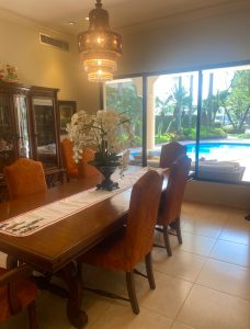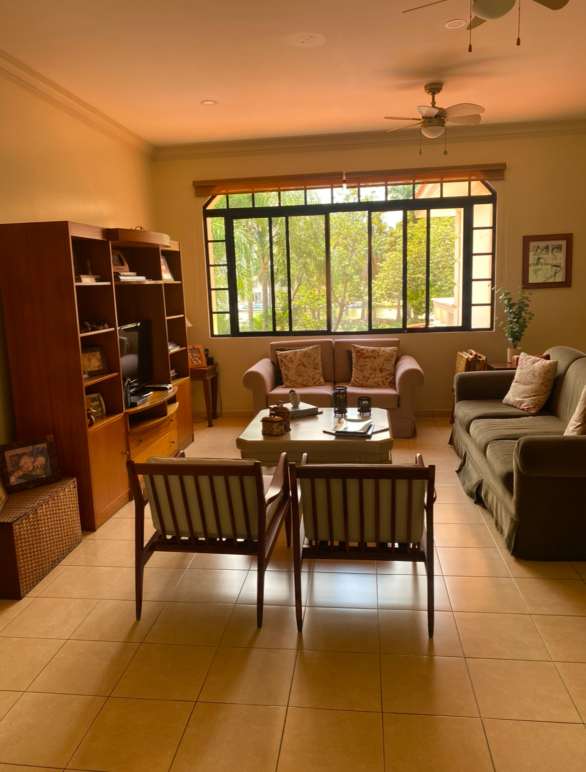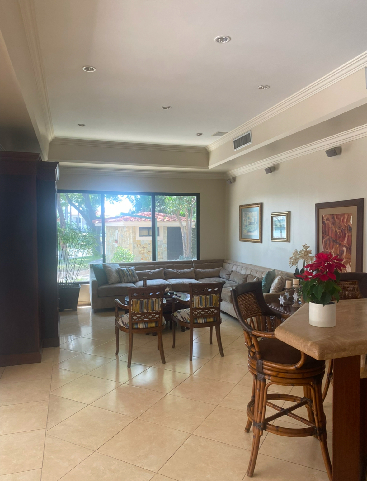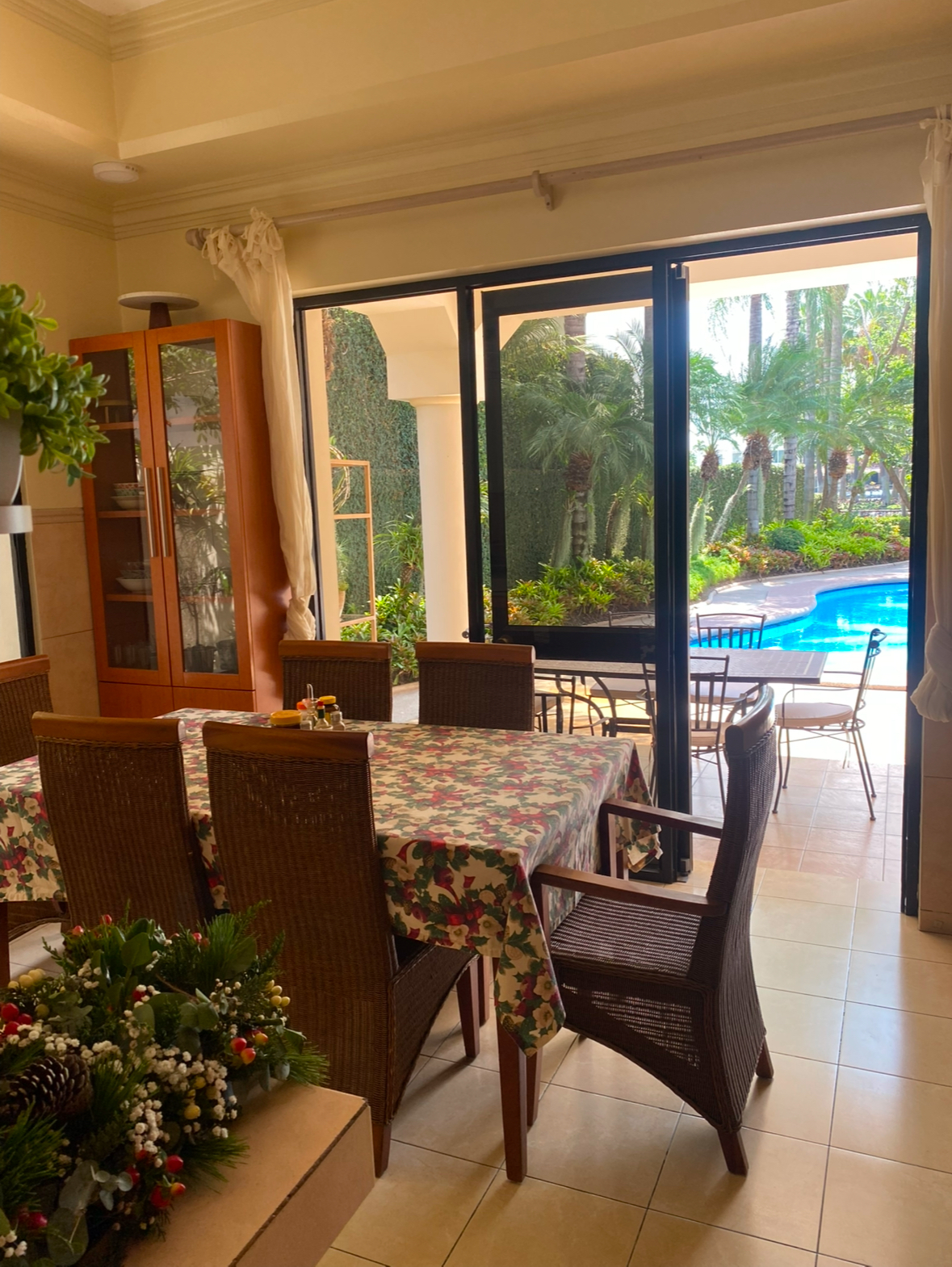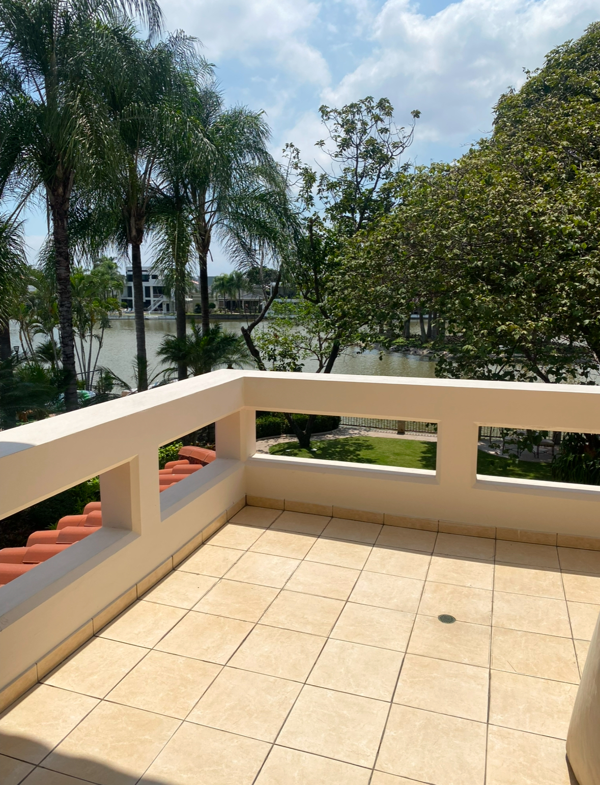 Planta Baja con: 2 salas, bar, area de comedor de diario y comedor formal, estudio con baño completo, además de un amplio patio a la laguna con pérgola, piscina y baño completo.